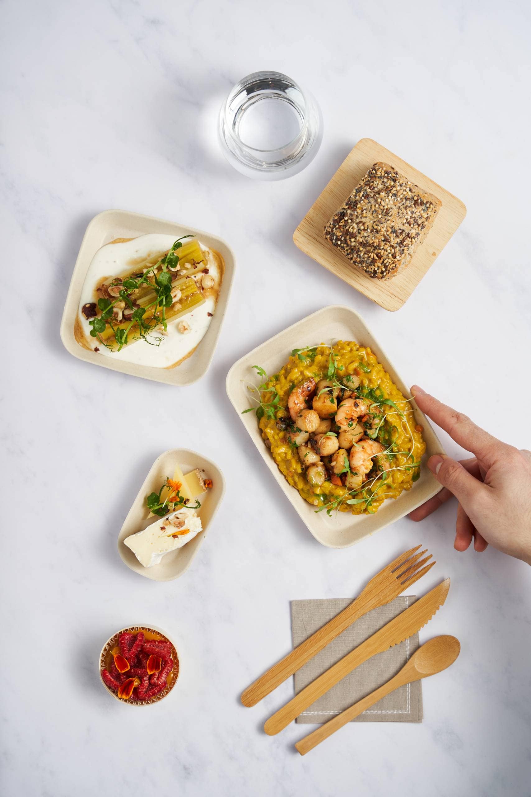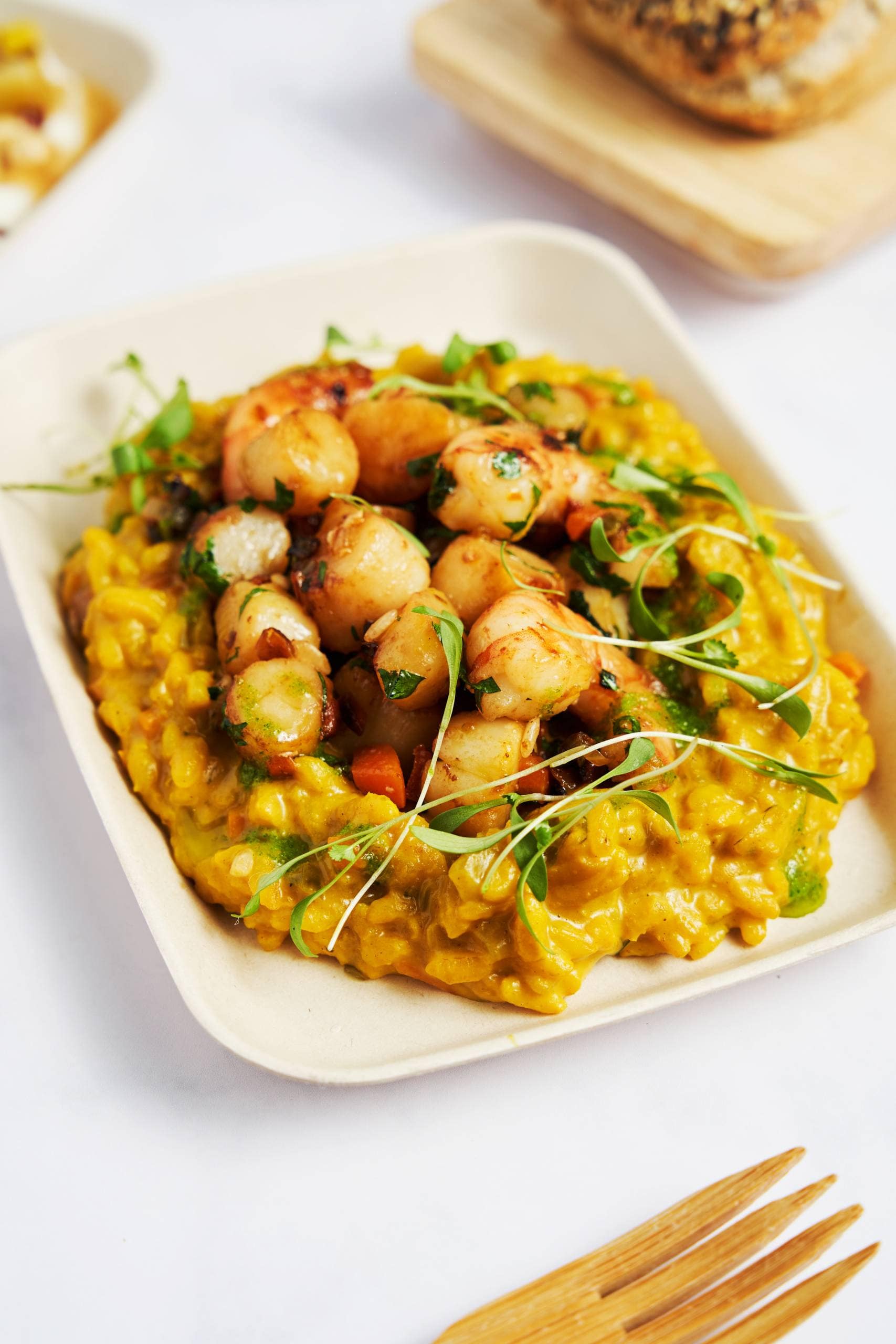 Risotto aux pétoncles, gambas, bouillon maison, petits légumes, herbes fraiches
