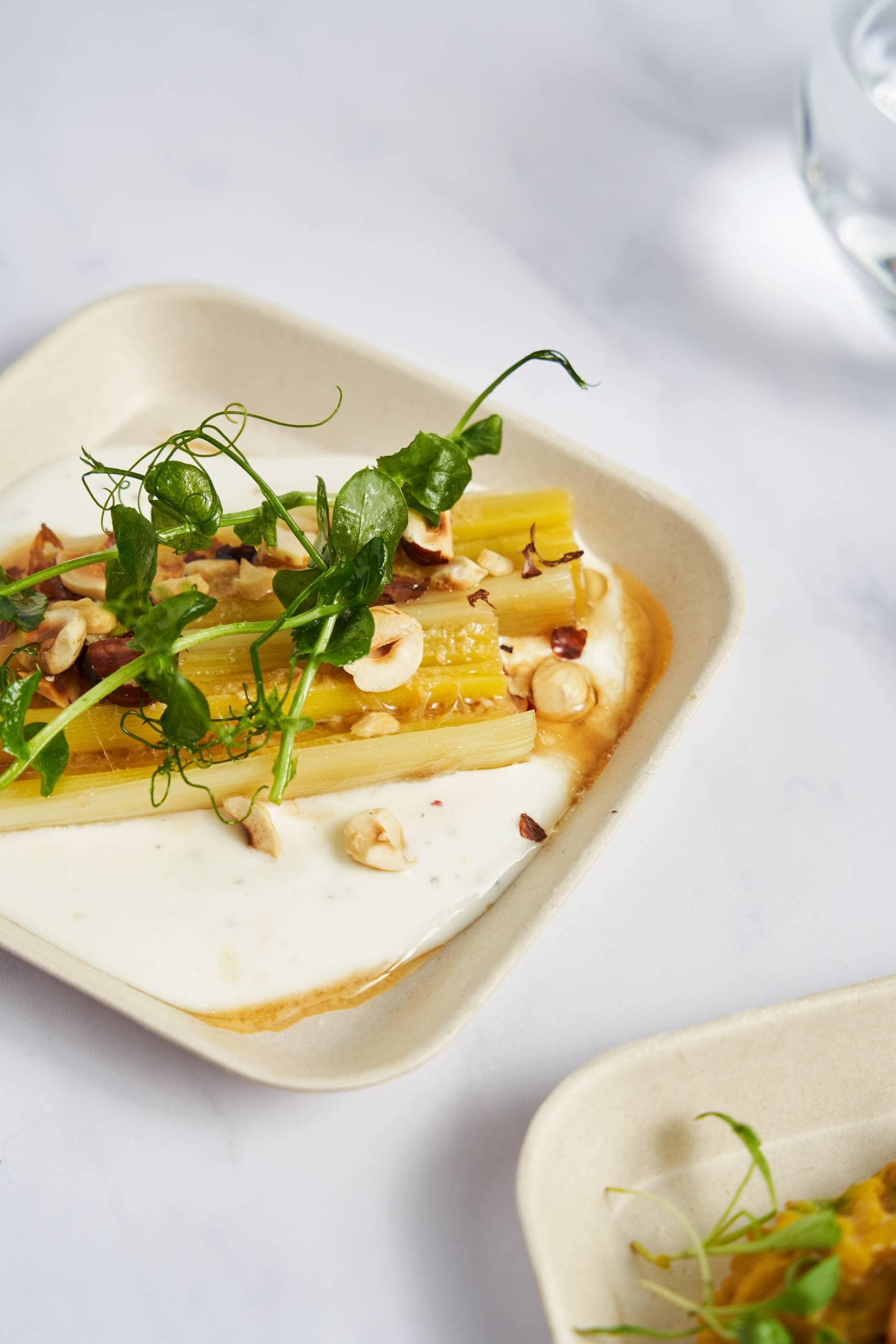 Poireau vapeur, vinaigrette miso, sauce yaourt, pignons de pin torréfiés et jeunes pousses
