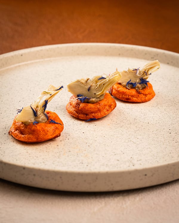 Moelleux salé caviar d’aubergine et artichaut mariné