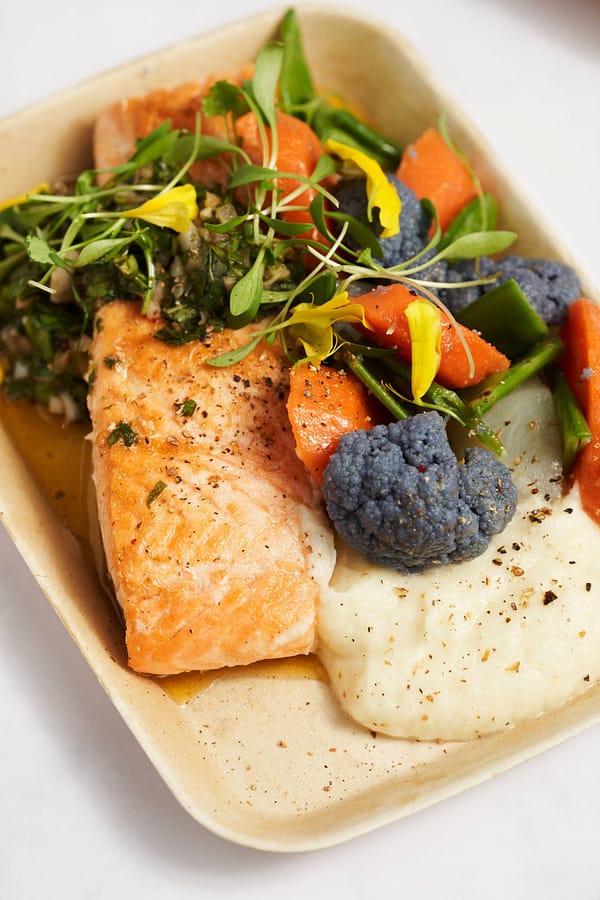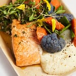 Pavé de saumon, jardinière de légumes et mousseline céleri rave
